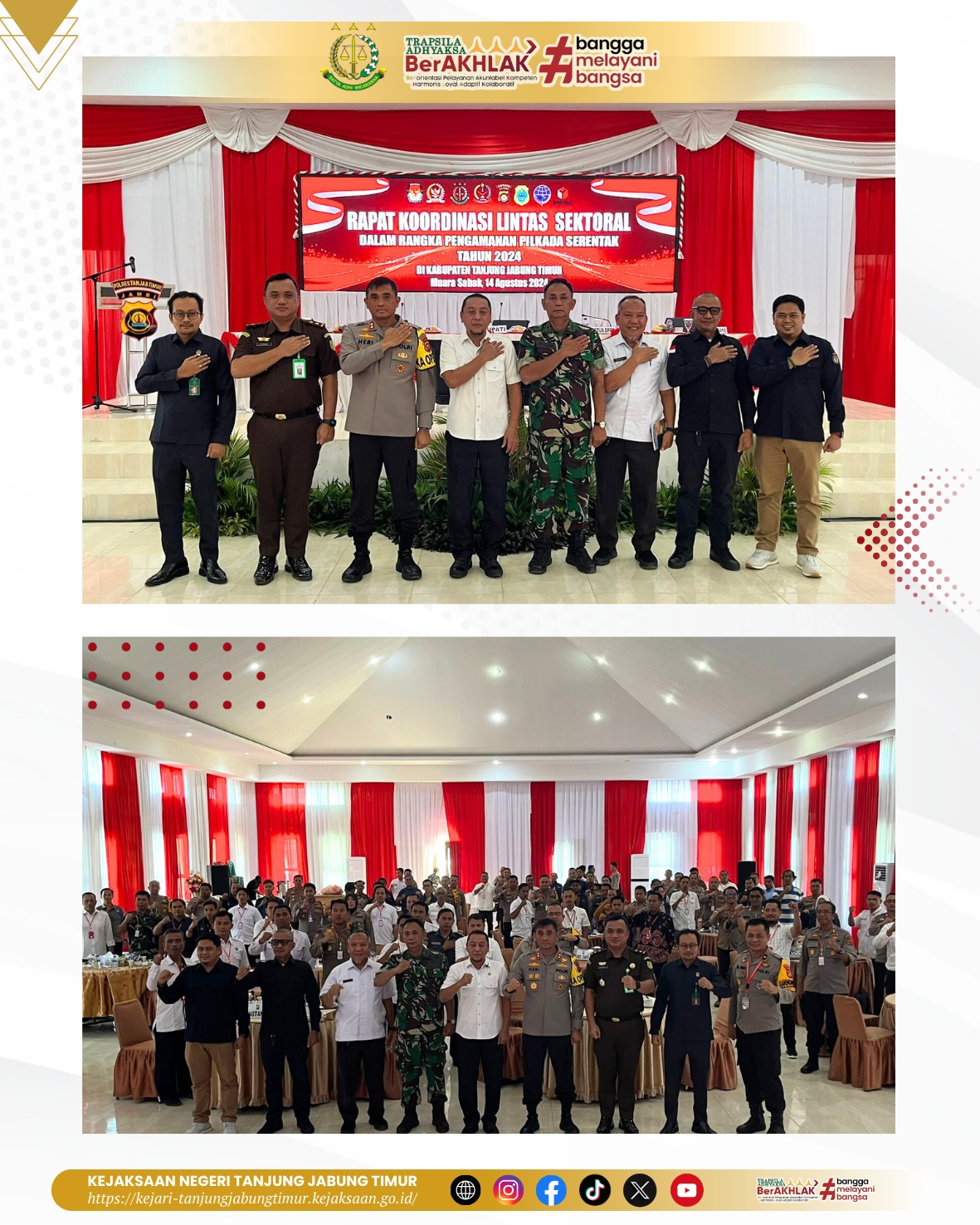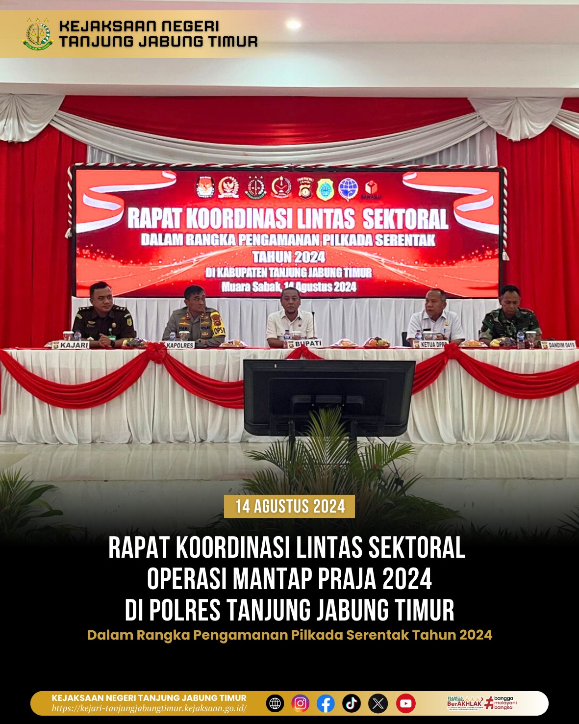 Rapat Koordinasi Lintas Sektoral Operasi Mantap Praja dalam rangka pengamanan Pilkada Serentak tahun 2024 dihadiri oleh Bupati Tanjung Jabung Timur diwakili Sekda Tanjung Jabung Timur (Sapril,S.IP), Kepala Polres Tanjung Jabung Timur (AKBP Heri Supriawan,S.I.K,M.H.), Pabung Kodim 0419/Tanjab (Mayor Inf.Ahamd Riad,S.,Ag.), Perwakilan Ketua DPRD Tanjung Jabung Timur (Sukri), Perwakilan Pengadilan Negeri Tanjung Jabung Timur (Tatok Musianto,S.H), Perwakilan KPU Tanjung Jabung Timur (Juni Yanto,S.IP.,M.SI), Perwakilan Bawaslu Tanjung Jabung Timur (Nurdin,S.E), Para Camat se-Kabupaten Tanjung Jabung Timur, Ketua PPK,Panwascam se-Kecamatan Tanjung Jabung Timur serta Beberapa Perwakilan OPD dan Forkopimda Kabupaten Tanjung Jabung Timur