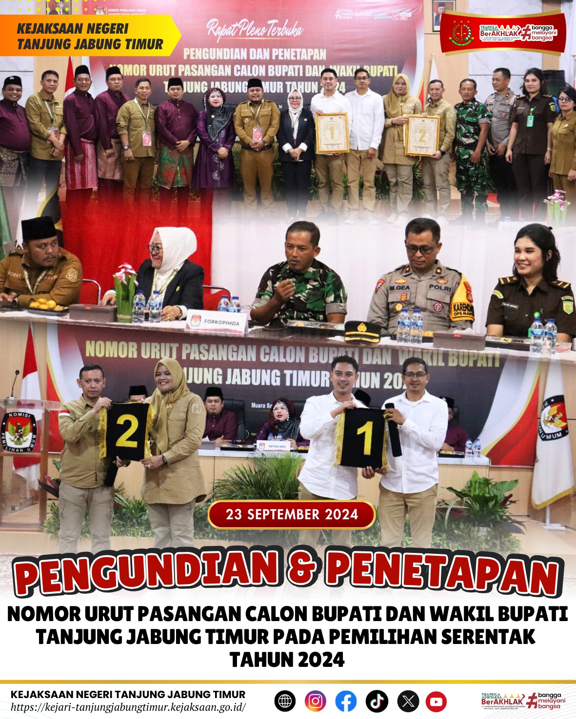 Pada hari Senin, 23 September 2024 di kantor KPU Tanjung Jabung Timur, pukul 13.30 WIB s/d selesai. Kejaksaan Negeri Tanjung Jabung Timur diwakili Staff Intelijen (Hillary Sibarani, S.H.) telah menghadiri Pengundian dan Penetapan Nomor Urut Pasangan Calon Bupati dan Wakil Bupati Tanjung Jabung Timur Pada Pemilihan Serentak Tahun 2024.