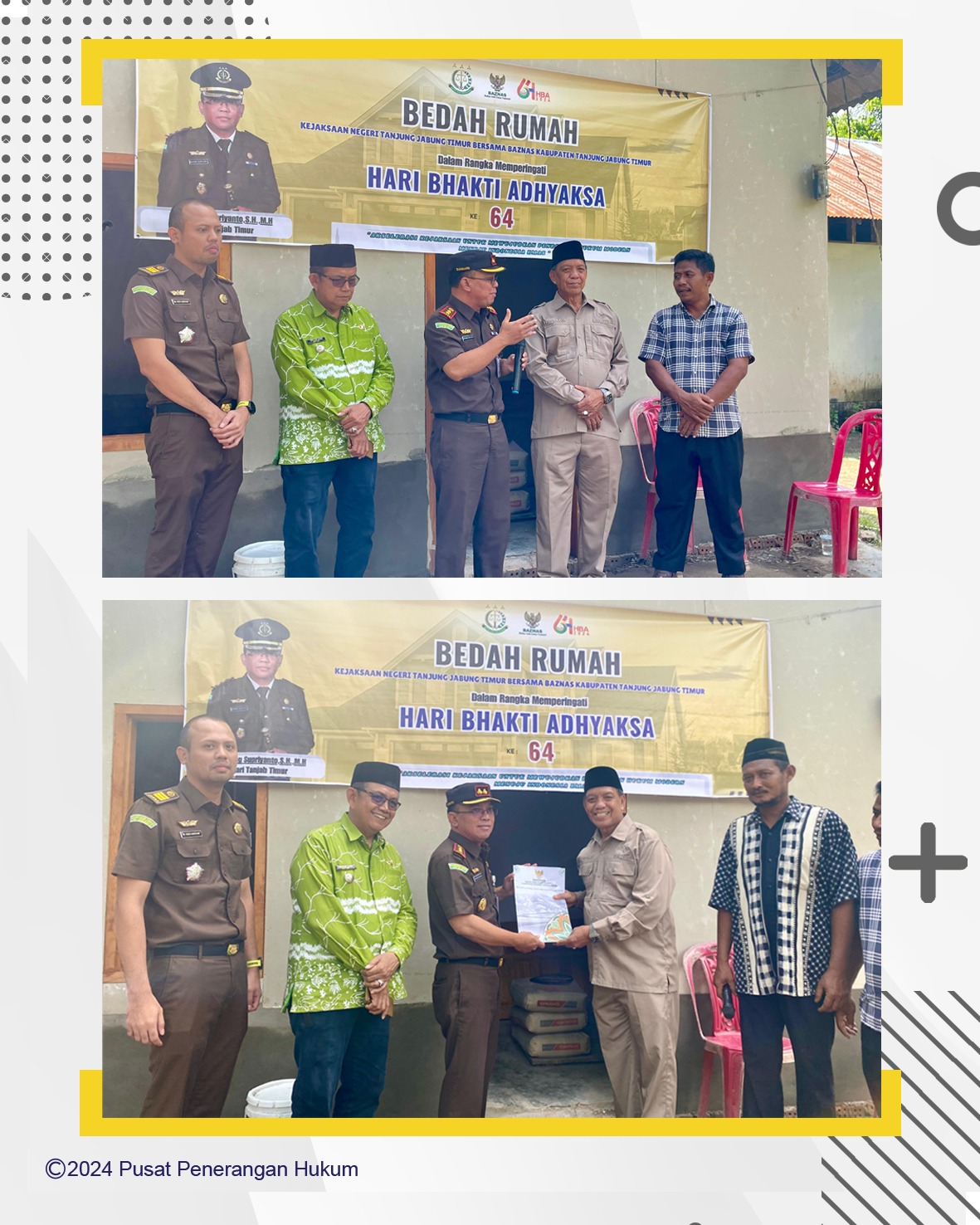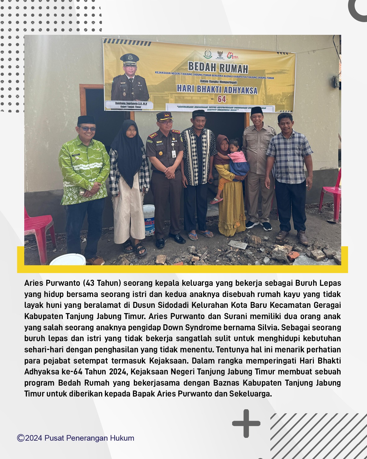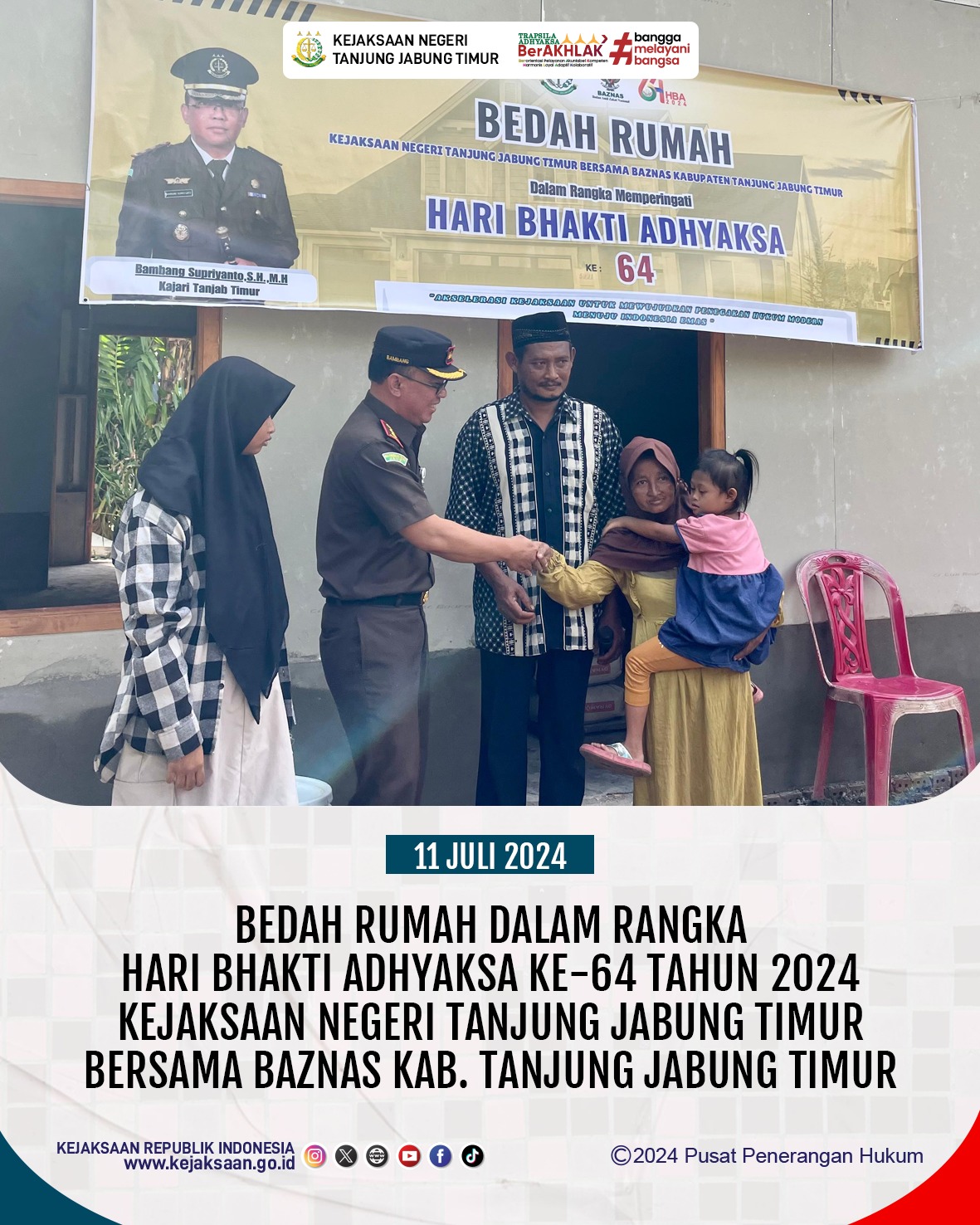 ada hari Kamis, 11 Juli 2024 pukul 09.30 WIB s/d Selesai, bertempat di Dusun Sidodadi Kelurahan Kota Baru Kecamatan Geragai Kabupaten Tanjung Jabung Timur, Kepala Kejaksaan Negeri Tanjung Jabung Timur (Bambang Supriyanto, S.H., M.H.) beserta para Kasi Tanjung Jabung Timur telah melaksanakan Kegiatan Bedah Rumah (Sdr. Aries Purwanto) Dalam Rangka Haro Bhakti Adhyaksa ke-64 Tahun 2024 Kejaksaan Negeri Tanjung Jabung Timur bersama Baznas Kabupaten Tanjung Jabung Timur yang dihadiri langsung oleh Ketua Baznas (Drs. H. Syarifuddin)