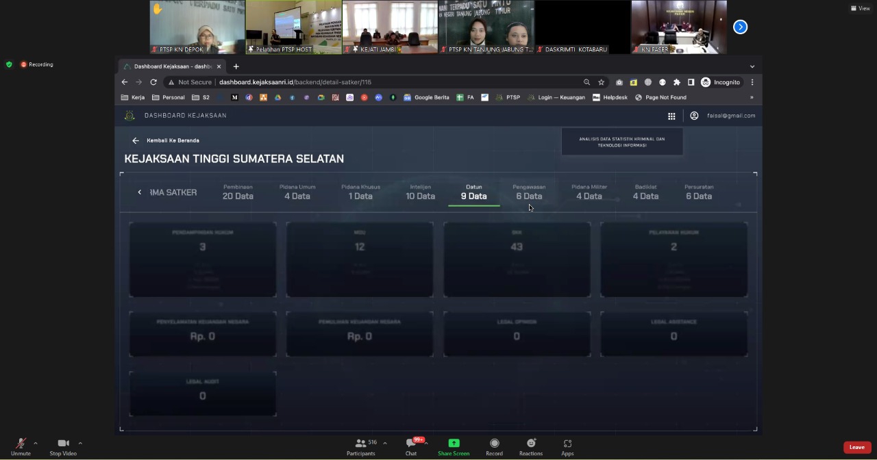 Pelaksanaan kegiatan Bimbingan Teknis Perangkat dan Sistem Pendukung PTSP tahun 2022 diikuti oleh Staff Pembinaan (Mey Dini Retnowati,A.Md.I.P.) dan Petugas PTSP (Maisarah Ulpah,S.Pd.) di Gedung PTSP Kejaksaan Negeri Tanjung Jabung Timur secara virtual melalui zoom meeting. (Rabu, 28/12/2022)