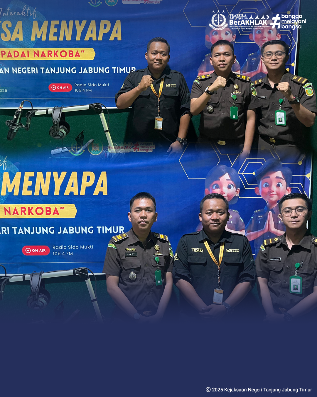 Pada hari Kamis, 26 Juni 2025 pukul 10.00 WIB telah dilaksanakan kegiatan Dialog Interaktif Jaksa Menyapa melalui siaran radio SM Radio 105.4 FM yg berlokasi di Jalan Wr. Supratman RT 03 RW 01 Kelurahan Talang Babat Kecamatan Muara Sabak Barat Kabupaten Tanjung Jabung Timur