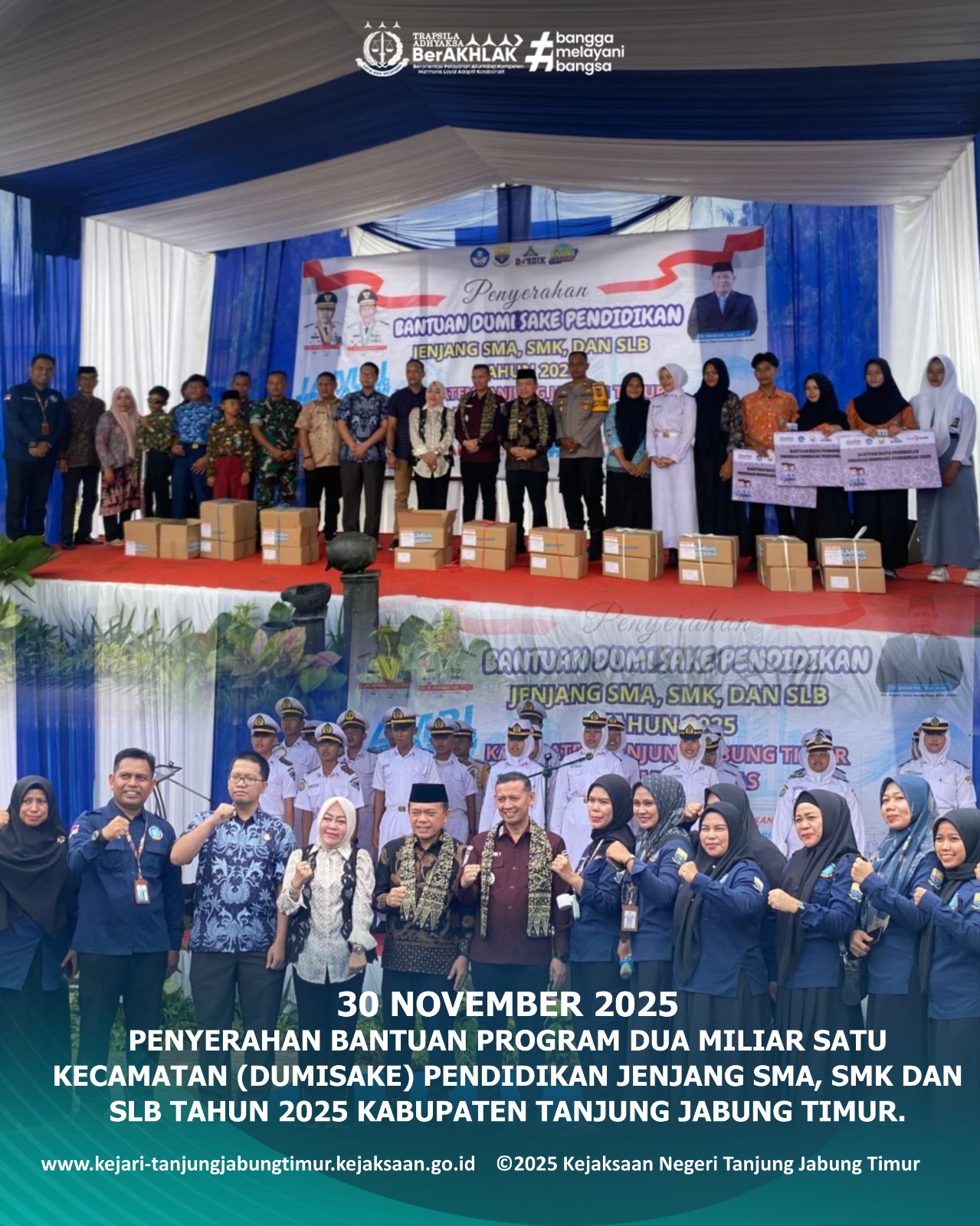 Pada Minggu, 30 November 2025, sekira pukul 12.00 WIB, bertempat di SMKN 1 Tanjung Jabung Timur, dilaksanakan acara Penyerahan Bantuan Program Dua Miliar Satu Kecamatan (Dumisake) Pendidikan untuk jenjang SMA, SMK, dan SLB Tahun 2025 di Kabupaten Tanjung Jabung Timur.