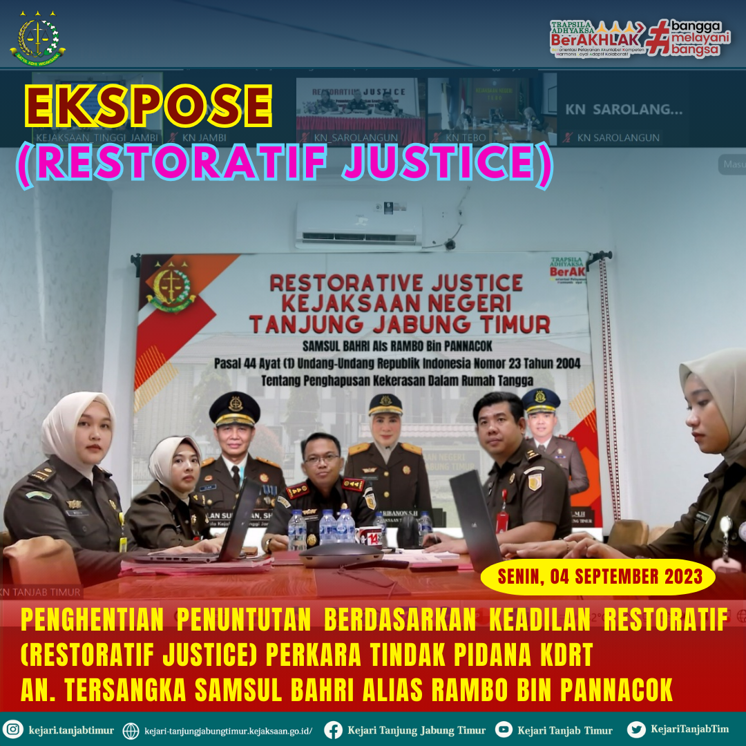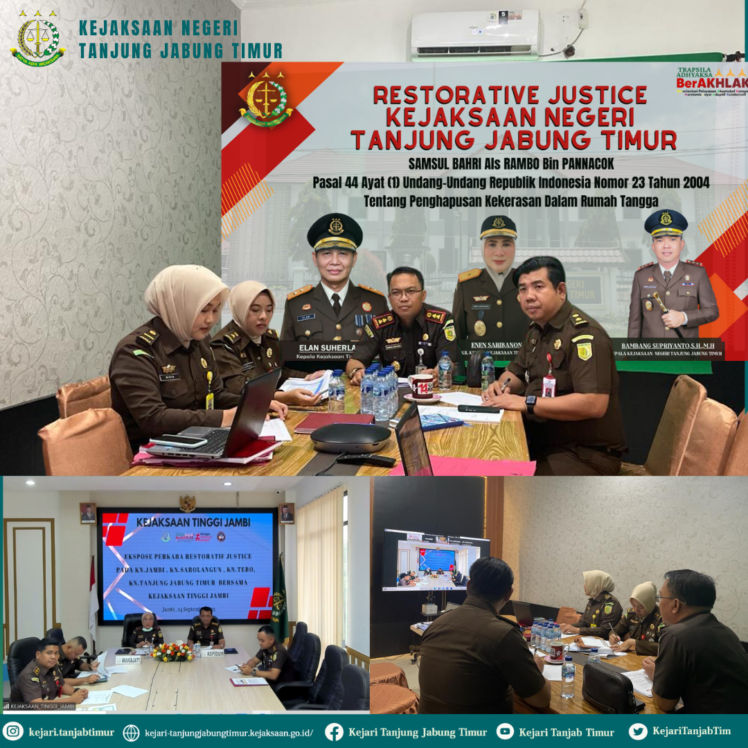 pada hari Senin tanggal 04 September 2023 pukul 14.00 WIB s/d Selesai bertempat di Ruang Vicon Pidum Kejaksaan Negeri Tanjung Jabung Timur telah dilaksanakan kegiatan Ekspose Internal Upaya Penghentian Penuntutan Berdasarkan Keadilan Restoratif (Restoratif Justice) perkara tindak pidana KDRT an. Tersangka SAMSUL BAHRI ALIAS RAMBO BIN PANNACOK kepada Kejaksaan Tinggi Jambi melalui sarana Zoom Meeting