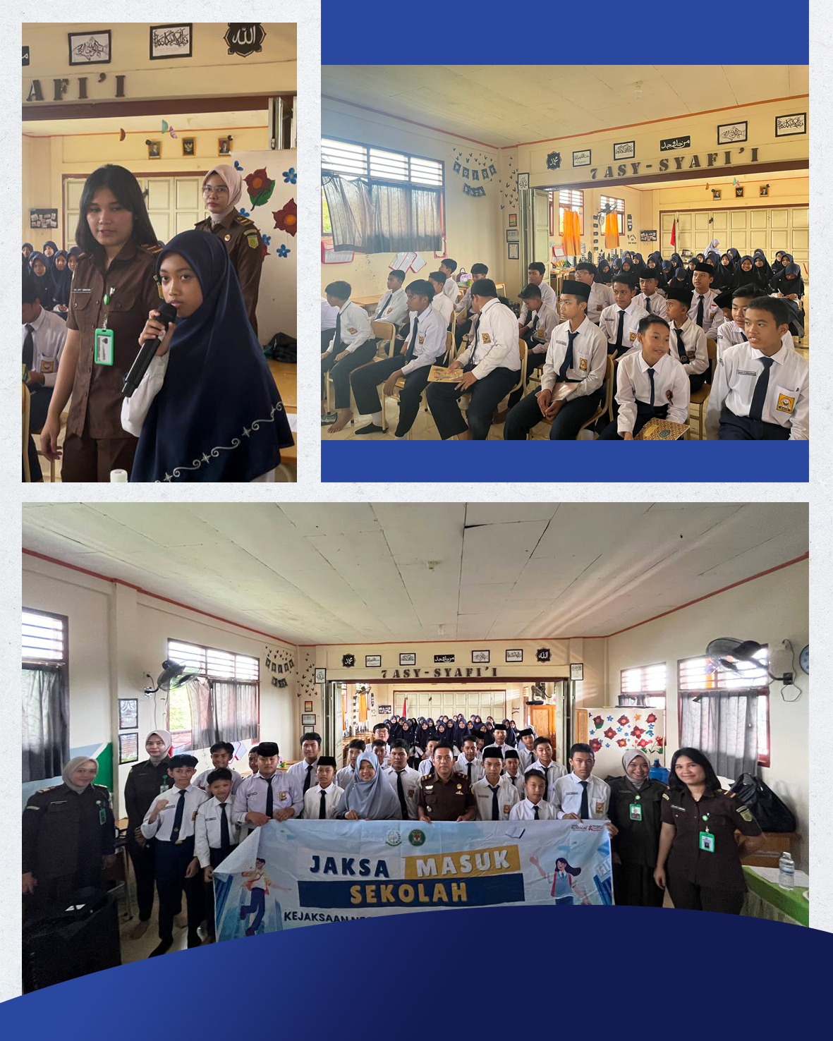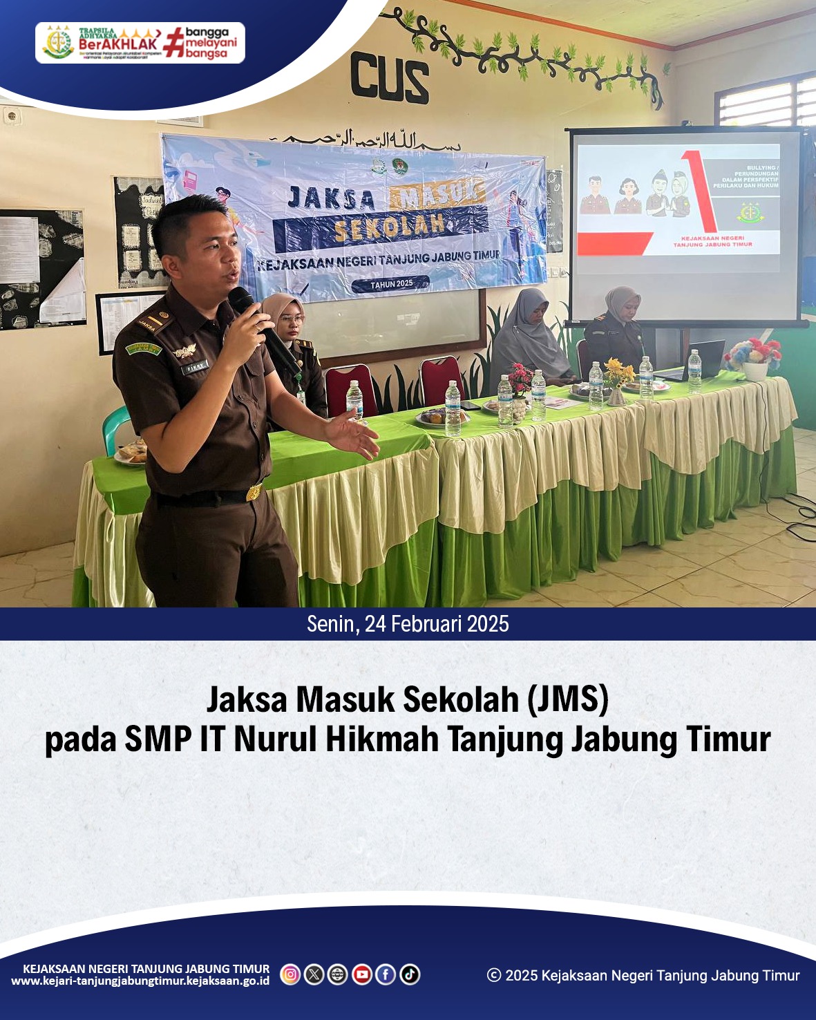 Pada hari Senin,10 Februari 2025, pukul 10:00 WIB, Seksi Intelijen Kejaksaan Negeri Tanjung Jabung Timur telah melaksanakan Kegiatan Jaksa Masuk Sekolah (JMS) pada SMPN IT Nurul Hikmah Tanjung Jabung Timur. Kegiatan diawali dengan kata sambutan oleh Kepala Sekolah SMPN IT Nurul Hilmah (Susanti,M.Pd), selanjutnya pembawaan materi oleh Kasubsi II Seksi Intelijen (Fikry Fachlevi,S.H) terkait Bullying/Perundungan Dalam Perspektif Perilaku dan Hukum