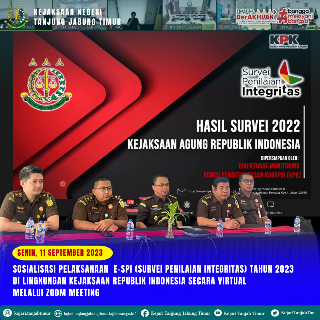 Pada hari Senin, 11 September 2023 pukul 08.30 Wib – Selesai bertempat di Aula Kantor Kejaksaan Negeri Tanjung Jabung Timur. Kajari Tanjung Jabung Timur (Bambang Supriyanto, S.H., M.H.) didampingi Kasi Intelijen (Bambang Harmoko, S.H., M.H.), Kasi Pidum ((Fusthathul Amul Huzni, S.H.), Kasi Datun (Hafiezd, S.H., M.H.) dan Kasi PB3R (Anggi Anggala Triwira, S.H., M.H) telah mengikuti kegiatan Sosialisasi Pelaksanaan E-SPI (Survei Penilaian Integritas) Tahun 2023 di Lingkungan Kejaksaan Republik Indonesia secara virtual melalui zoom meeting.