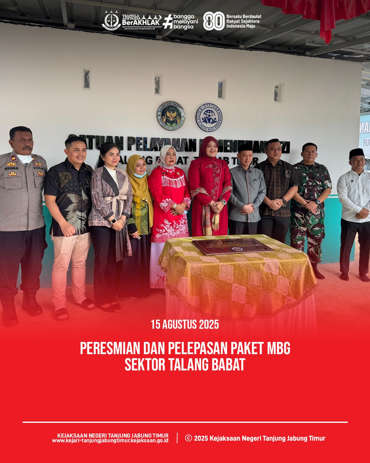 TANJUNG JABUNG TIMUR – Kejaksaan Negeri (Kejari) Tanjung Jabung Timur turut berpartisipasi dalam mendukung program kesejahteraan anak-anak sekolah. Pada hari Jumat, 15 Agustus 2025, pukul 07.30 WIB, Kepala Seksi Intelijen, Rahmad Abdul, S.H., mewakili Kepala Kejaksaan Negeri untuk menghadiri peresmian dan pelepasan paket Makan Bergizi Gratis (MBG).