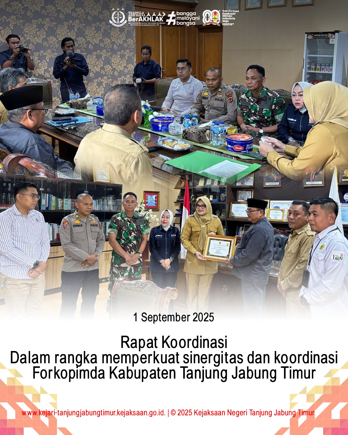 Tanjung Jabung Timur – Kejaksaan Negeri (Kejari) Tanjung Jabung Timur, yang diwakili oleh Kasi Pemulihan Aset dan Barang Bukti, Anggi Anggala Tri Wira, S.H., M.H., menghadiri Rapat Koordinasi (Rakor) Forum Komunikasi Pimpinan Daerah (Forkopimda) Kabupaten Tanjung Jabung Timur. Acara ini berlangsung pada hari Senin, 1 September 2025, pukul 09.30 WIB, di Ruang Kerja Bupati Tanjung Jabung Timur.