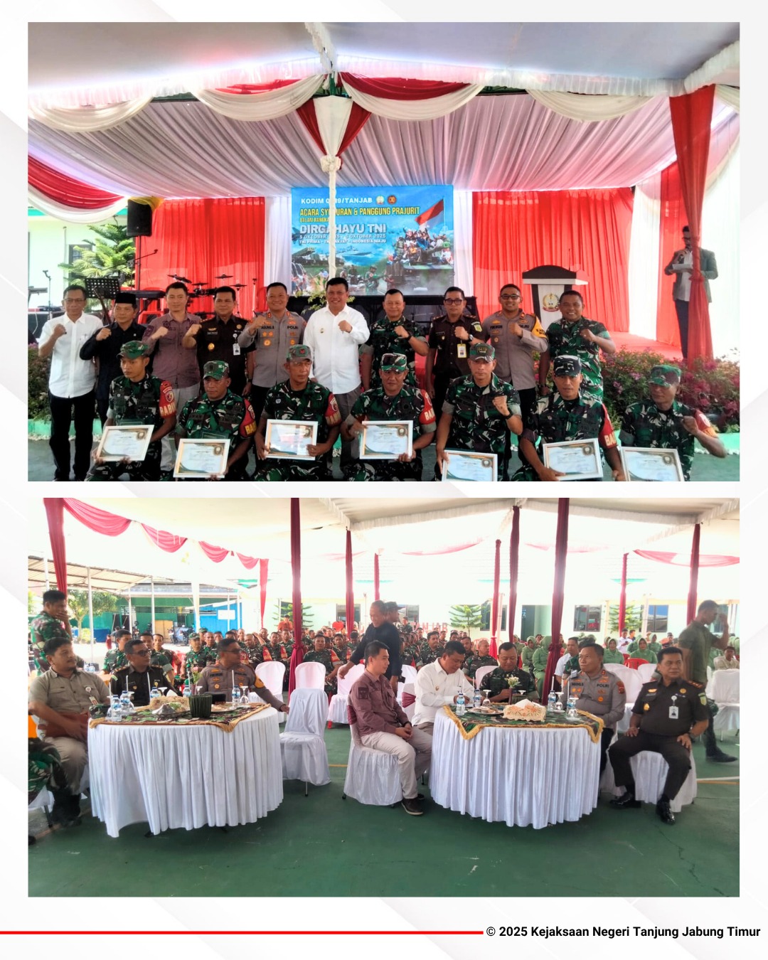 Kuala Tungkal – Kejaksaan Negeri (Kejari) Tanjung Jabung Timur turut berpartisipasi dalam perayaan Hari Ulang Tahun (HUT) Ke-80 Tentara Nasional Indonesia (TNI) Tahun 2025 yang diselenggarakan di Markas Komando Distrik Militer (Makodim) 0419/Tanjab, Kuala Tungkal, Kabupaten Tanjung Jabung Barat.