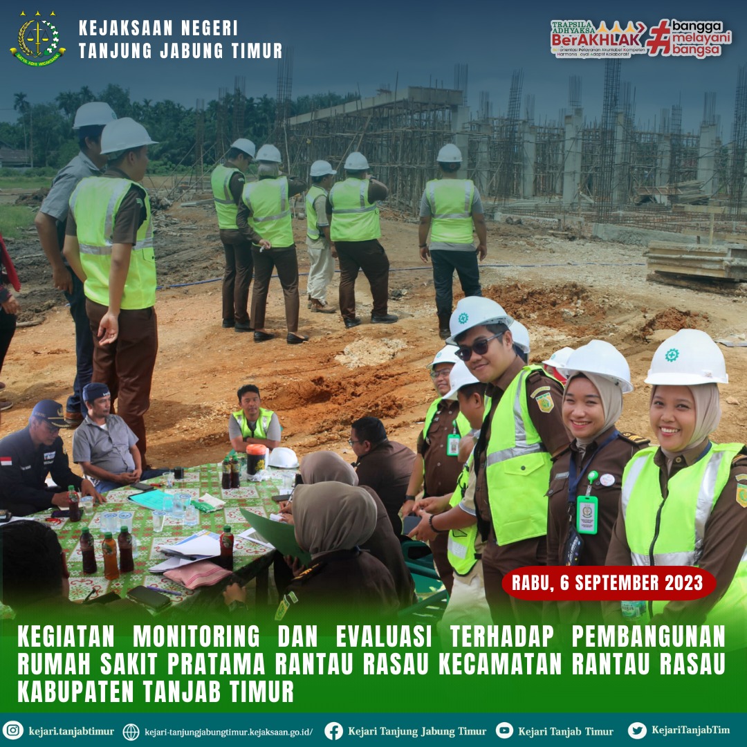 pada hari Kamis tanggal 7 September 2023 telah dilaksanakan kegiatan Monitoring dan Evaluasi terhadap Pekerjaan Pembangunan Rumah Sakit Pratama Rantau Rasau Kec. Rantau Rasau Kab. Tanjab Timur;