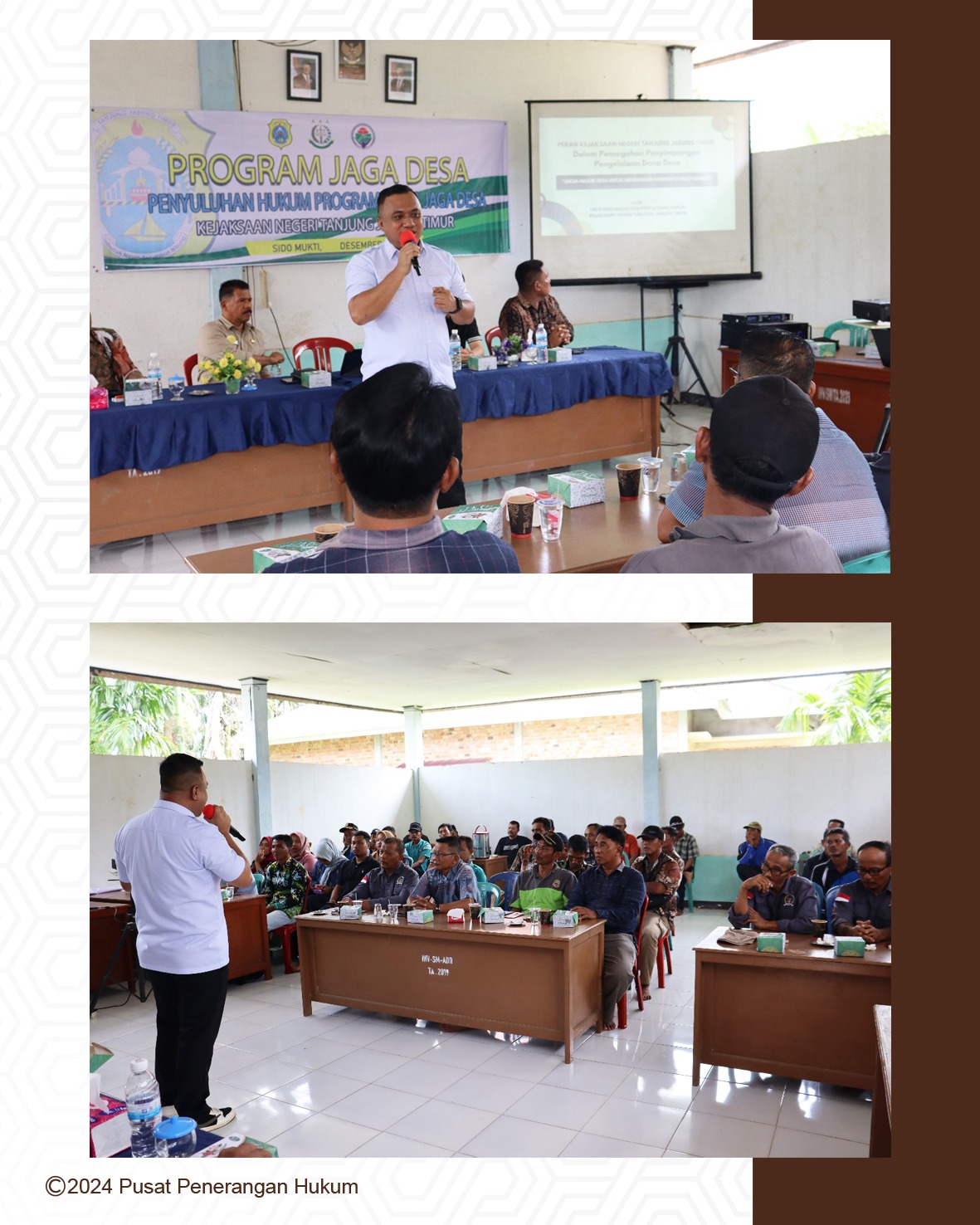 6 Desember 2024, pukul 10:00 WIB di Aula Kantor Desa Sido Mukti, Kepala Kejaksaan Negeri Tanjung Jabung Timur diwakili Seksi Intelijen (Rahmad Abdul, S.H) beserta Kasubsi I Seksi Intelijen Kejaksaan Negeri Tanjung Jabung Timur (Kukuh Prima, S.H) telah melaksanakan kegiatan Penyuluhan Hukum Jaksa Garda Desa (Jaga Desa) tentang “Pengelolaan Keuangan Desa dan Aset Desa, Pengadaan Barang Jasa di Desa dan Peningkatan Pemberdayaan Masyarakat melalui Badan Usaha Milik Desa”