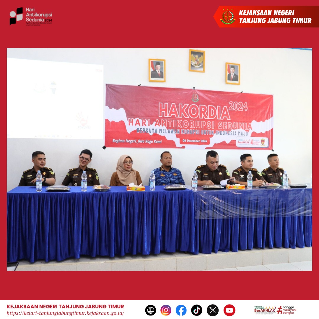pada hari Senin 9 Desember 2024, telah dilaksanakan rangkaian kegiatan dalam rangka memperingati Hari Anti Korupsi Sedunia (Hakordia) 2024 pada Kejaksaan Negeri Tanjung Jabung Timur
