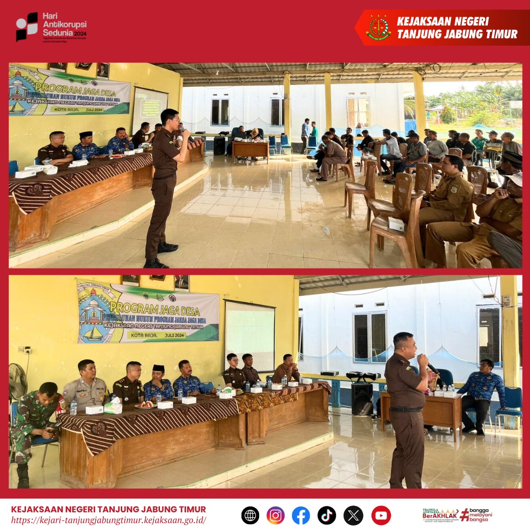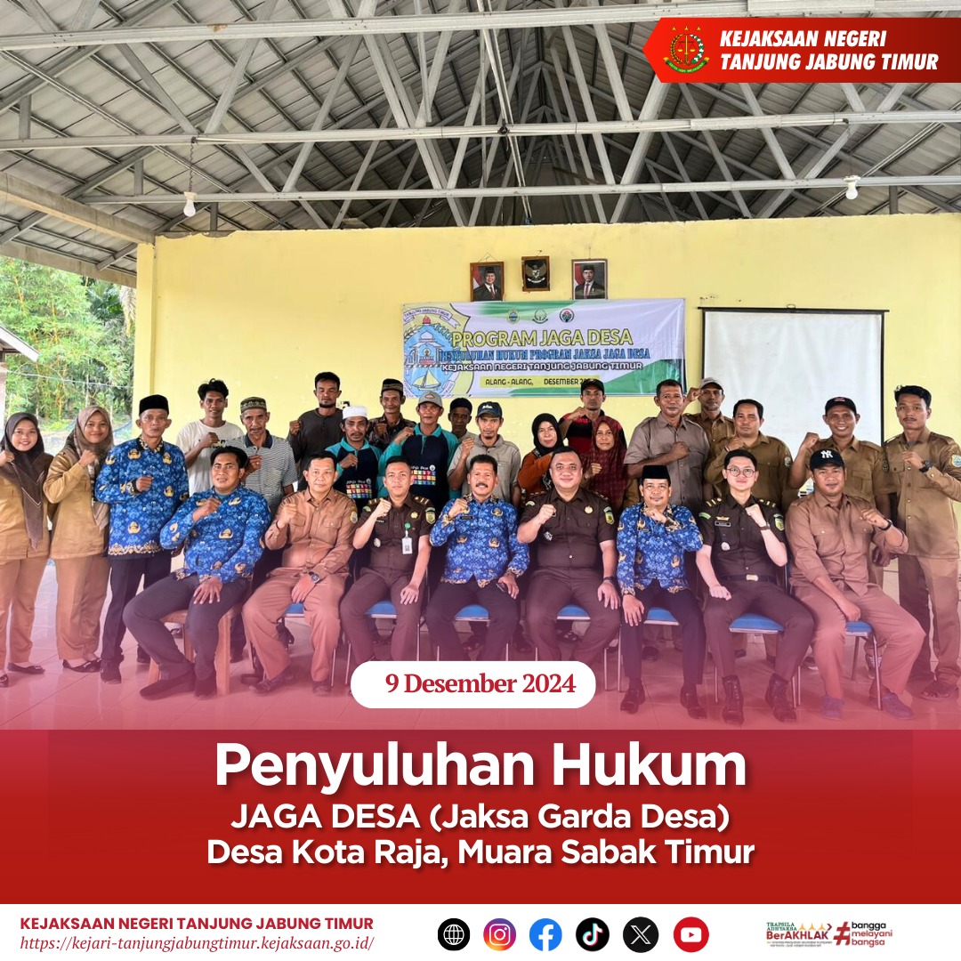 Untuk menutup rangkaian kegiatan peringatan Hari Anti Korupsi Sedunia (Hakordia) pada Kejaksaan Negeri Tanjung Jabung Timur juga dilaksanakan kegiatan Jaksa Garda Desa (Jaga Desa) di Desa Kota Raja yang juga diikuti oleh para warga Desa Alang-Alang di Kec. Sabak Timur. Bahwa pada kegiatan tersebut diberi penyuluhan terkait “Pengelolaan Keuangan Desa dan Aset Desa,Pengadaan Barang Jasa di Desa dan Peningkatan Pemberdayaan Masyarakat melalui Badan Usaha Milik Desa” . Bahwa pemaparan-pemaparan tersebut khususnya pada poin Pengelolaan Keuangan Desa dan Aset Desa merupakan bentuk preventif dan pencegahan tindakan korupsi pada tingkatan pengelolaan keuangan di Desa,dan juga sejalan dengan pelaksanaan Hakordia dimana difokuskan tindakan preventif atau upaya pencegahan dan dengan warga desa serta perangkat desa sebagai target penyuluhan tersebut bertujuan untuk mencegah korupsi dari tingkat pemerintahan yang paling rendah,yaitu Desa