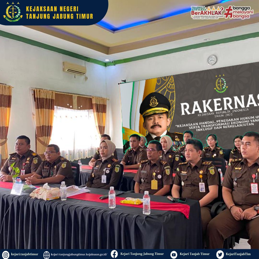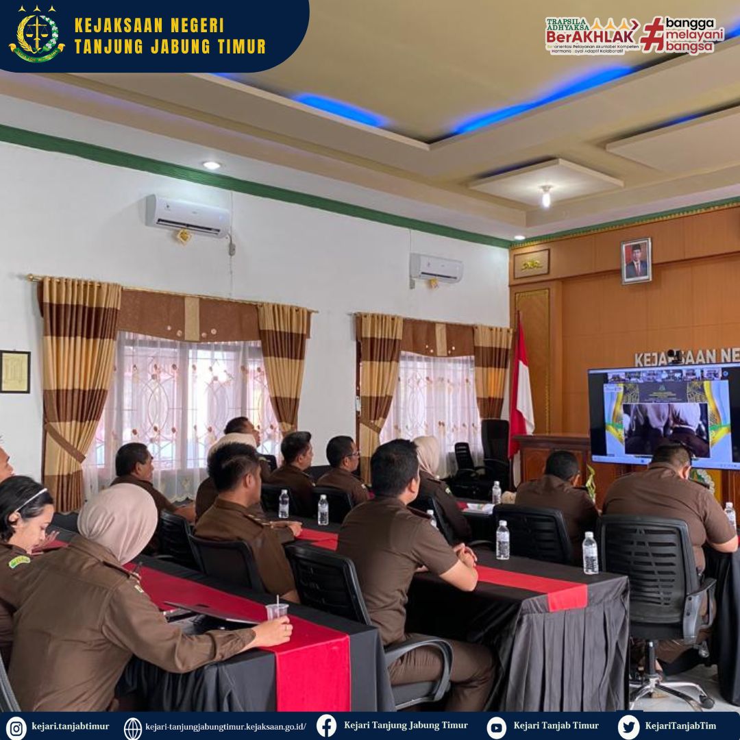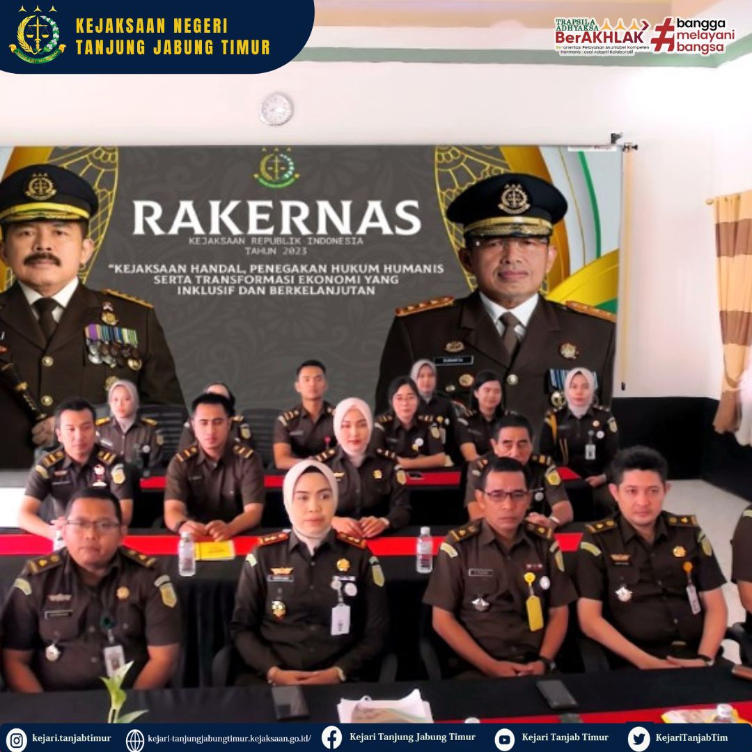 Rapat Kerja Nasional (Rakernas) Kejaksaan Republik Indonesia Tahun 2023 Hari ke-3 (tiga) secara virtual melalui zoom meeting diikuti oleh Kepala Kejaksaan Negeri Tanjung Jabung Timur (Yenita Sari, S.H.,M.H) didampingi para Kasi, Kasubbag dan Pegawai Kejaksaan Negeri Tanjung Jabung Timur.