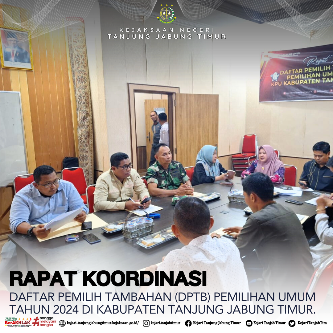 – Bahwa pada hari Rabu, 27 Desember 2023 jam 14:30 WIB s/d Selesai di Aula Kantor Komisi Pemilihan Umum Tanjung Jabung Timur dilaksanakan Rapat Koordinasi Daftar Pemilih Tambahan (DPTb) Pemilihan Umum Tahun 2024 di Kabupaten Tanjung Jabung Timur.