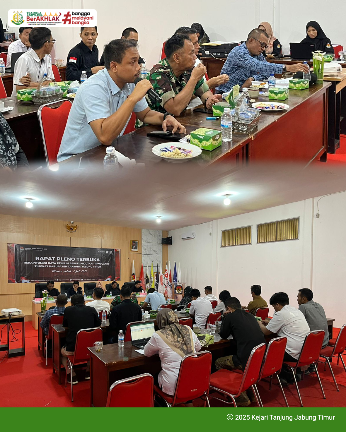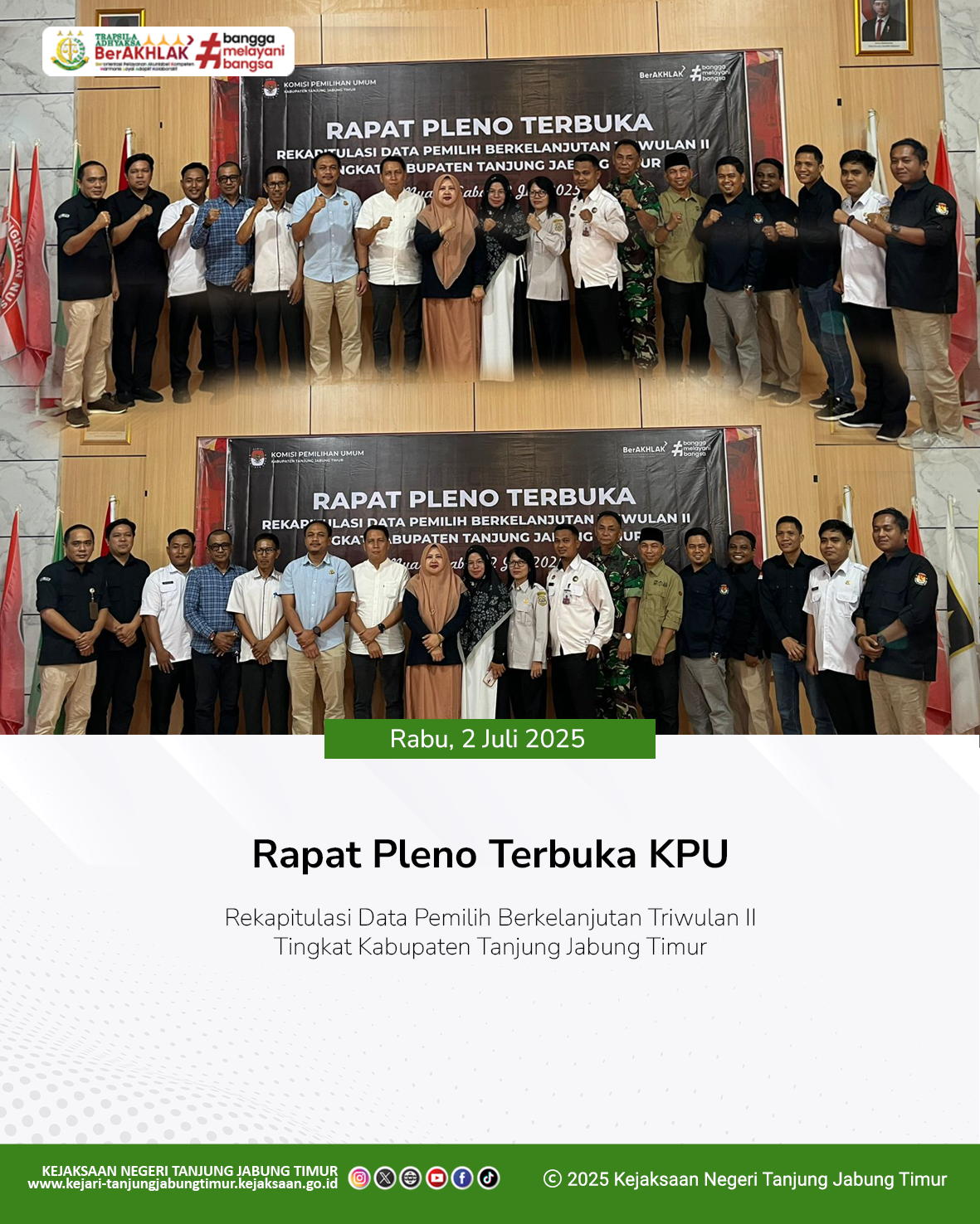 Pada 2 Juli 2025, Pukul 09:30 WIB bertempat di kantor Aula KPU Tanjung Jabung Timur, Kepala Seksi Pedata dan Tata Usaha Negara KN Tanjung Jabung Timur menghadiri kegiatan Rapat Pleno terbuka KPU terkait Rekapitulasi Data Pemilih Berkelanjutan Triwulan II Tingkat Kab. Tanjung Jabung Timur.