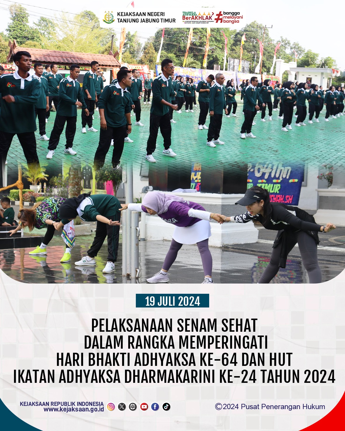 Pada hari Jumat, 19 Juli 2024 pukul 07.30 s/d selesai. Seluruh Pegawai Kejaksaan Negeri Tanjung Jabung Timur, Cabang Kejaksaan Negeri Tanjung Jabung Timur di Nipah Panjang dan Pengurus Ikatan Adhyaksa Dharmakarini Daerah Tanjung Jabung Timur melaksanakan Kegiatan Senam Pagi dalam Rangka Memperingati hari Bhakti Adhyaksa ke-64 dan HUT Ikatan Adhyaksa Dharmakarini ke-24 Tahun 2024.