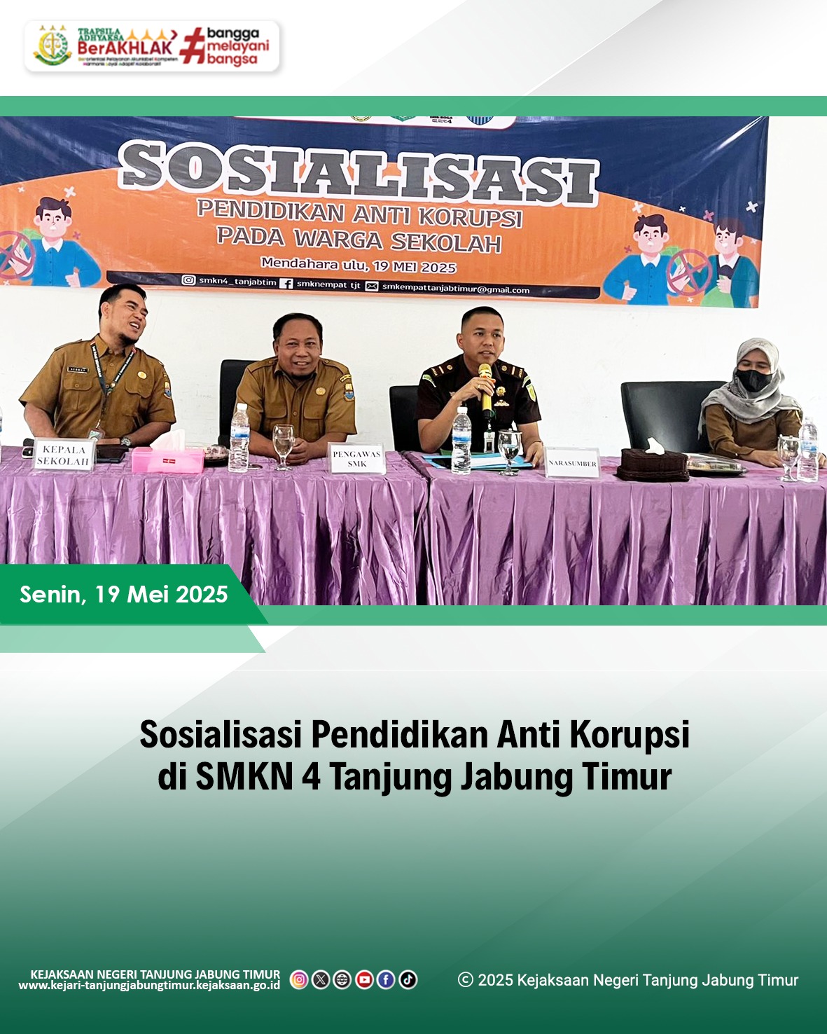 Pada hari Senin 19 Mei 2025, pukul 10:30 WIB bertempat di SMKN 4 Tanjung Jabung Timur. Kepala SubSeksi II Seksi Intelijen Kejaksaan Negeri Tanjung Jabung Timur (Fikry Fachlevi,S.H) telah menjadi Narasumber pada kegiatan Sosialisasi Pendidikan Anti Korupsi di SMKN 4 Tanjung Jabung Timur peserta yang terdiri dari para guru, staff TU, komite, Pengurus Osis siswa/i SMKN 4 yang berjumlah 40 orang.