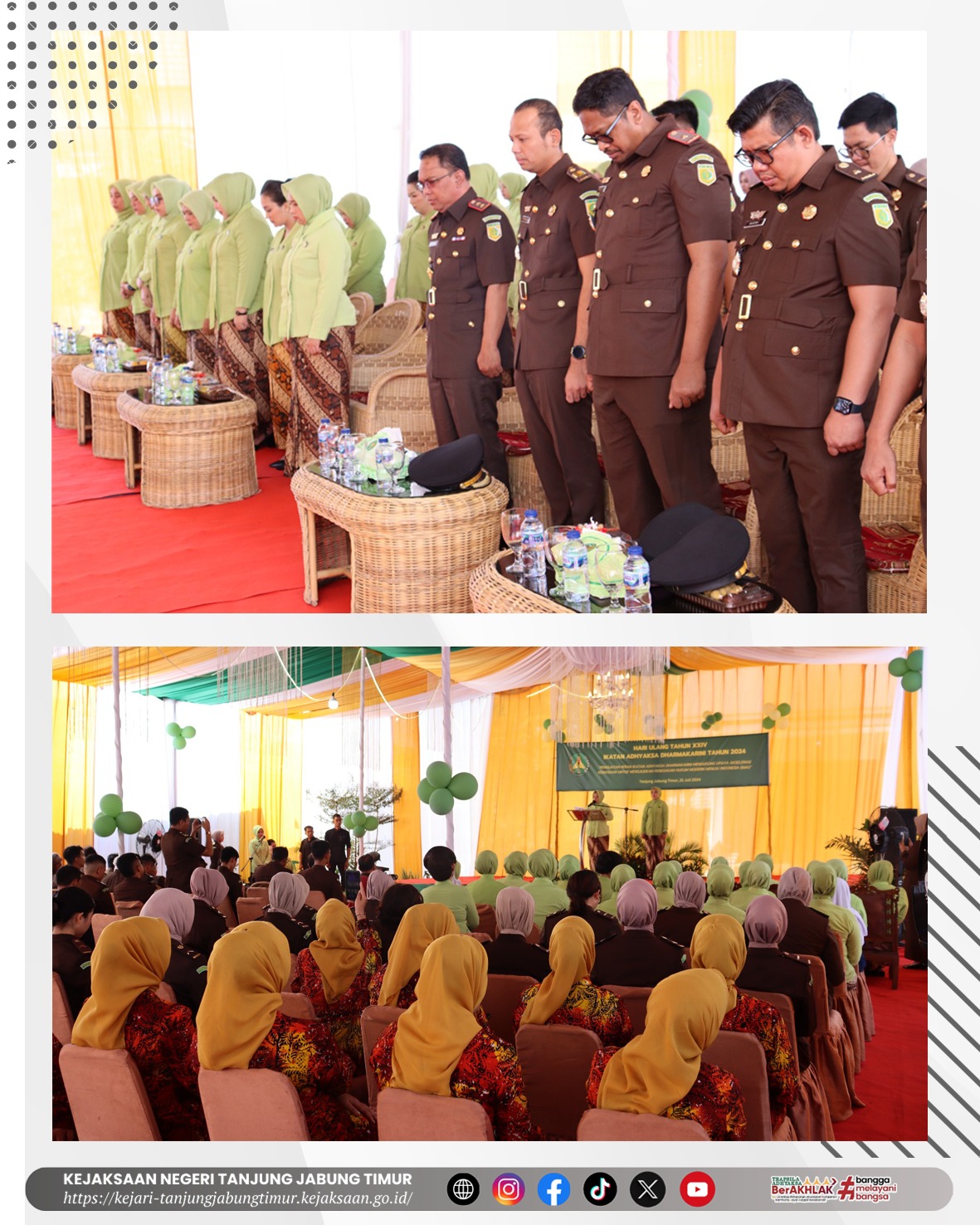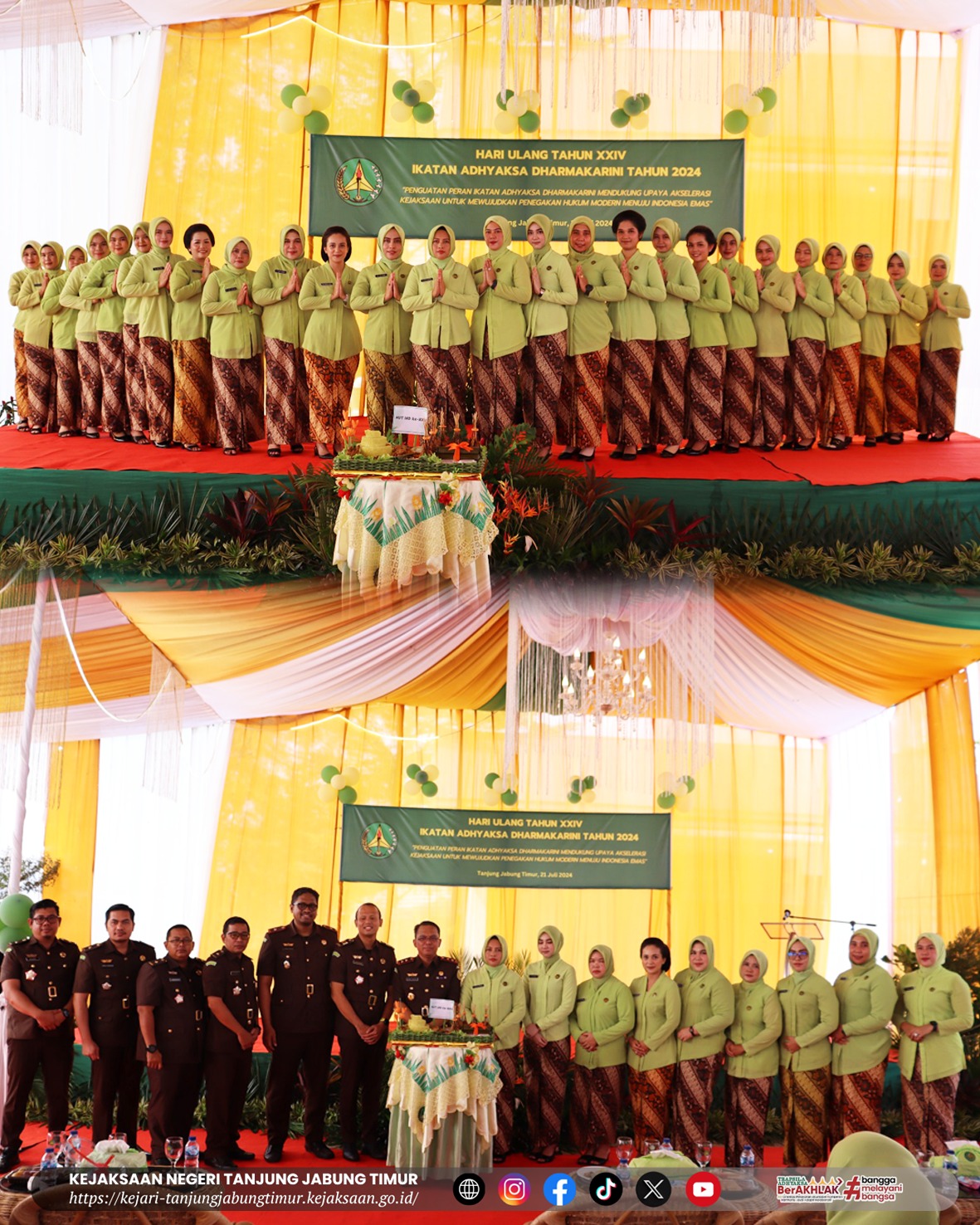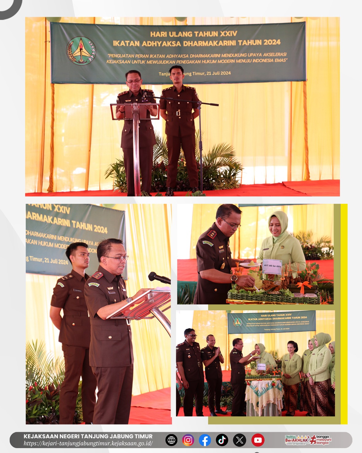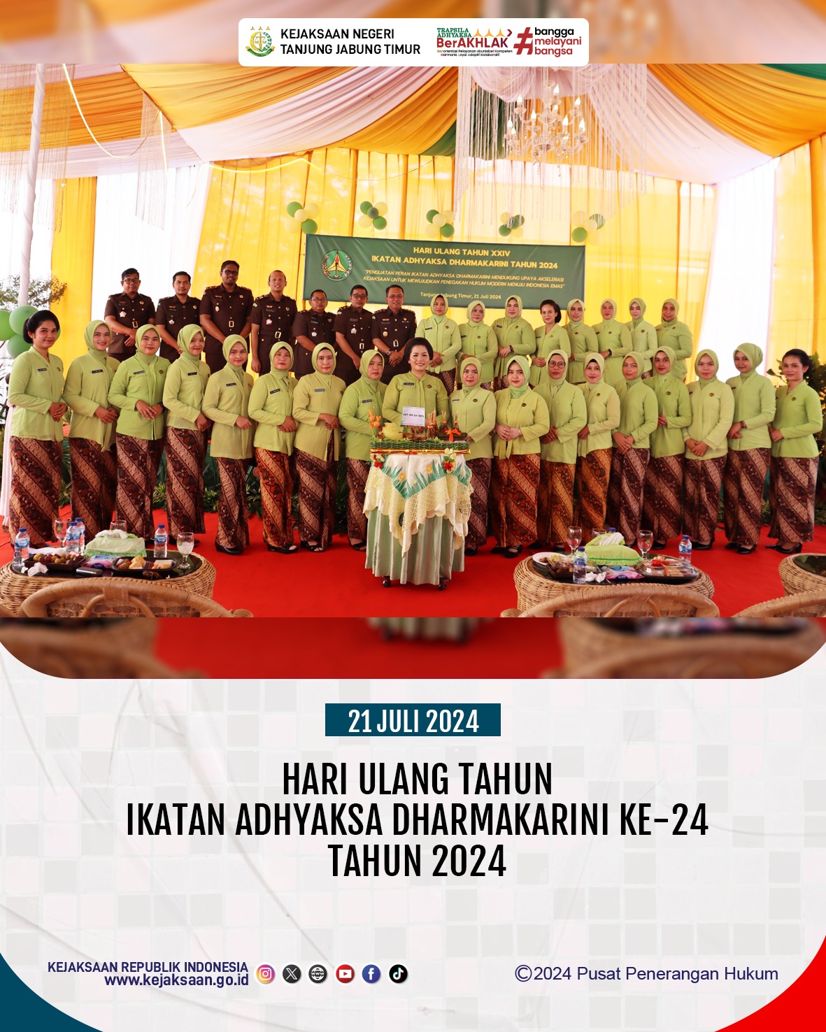 Pada hari Minggu, 21 Juli 2024 pukul 09.00 WIB. Keluarga Besar Kejaksaan Negeri Tanjung Jabung Timur dan Ikatan Adhyaksa Dharmakarini Daerah Tanjung Jabung Timur telah melaksanakan kegiatan Syukuran Hari Ulang Tahun Ikatan Adhyaksa Dharmakarini ke-24 Tahun 2024. Dengan tema “Akselerasi Kejaksaan Untuk Mewujudkan Penegakan Hukum Modern Menuju Indonesia Emas”.