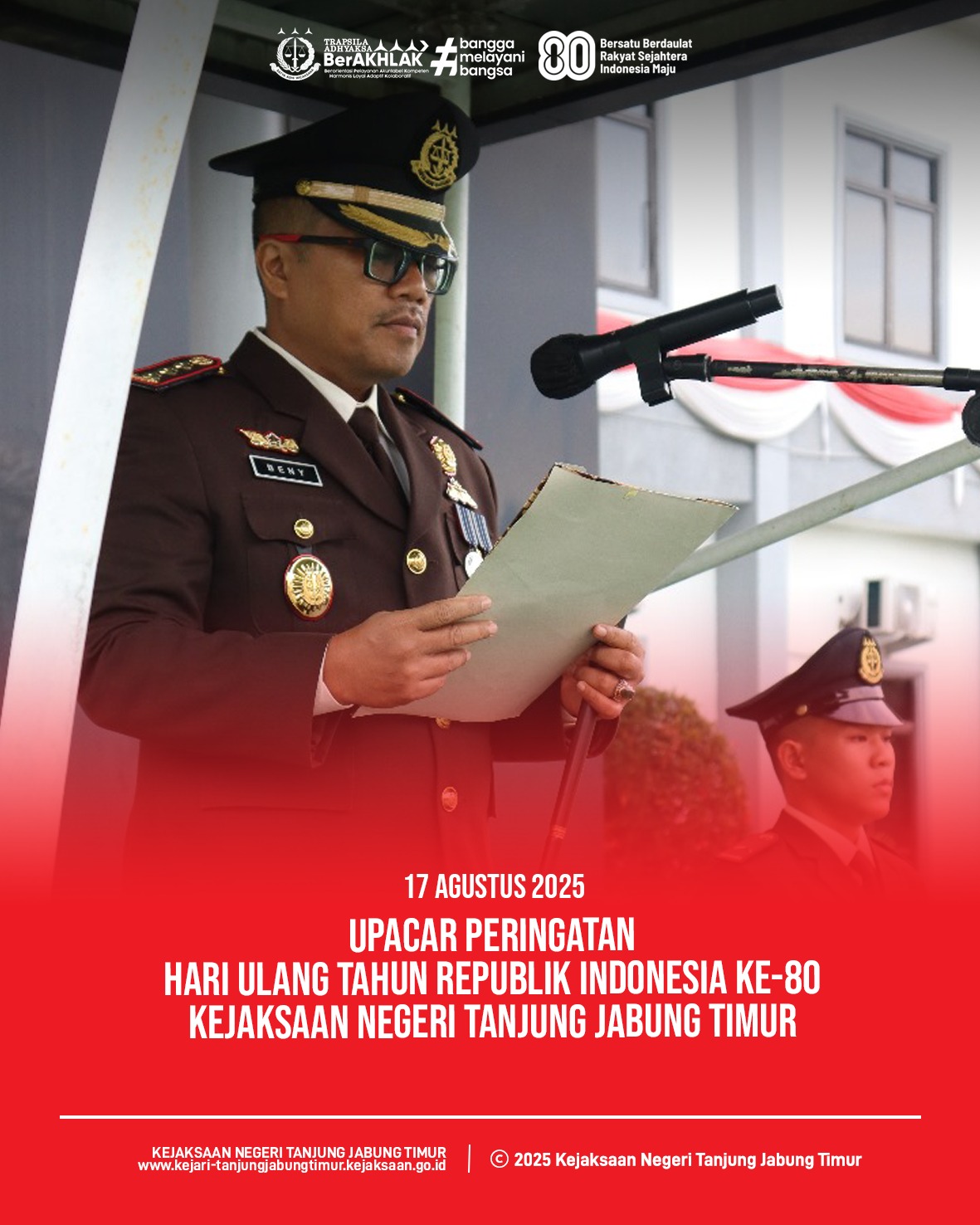 TANJUNG JABUNG TIMUR — Kejaksaan Negeri Tanjung Jabung Timur (Kejari Tanjabtim) menggelar upacara gabungan untuk memperingati Hari Ulang Tahun (HUT) ke-80 Kemerdekaan
