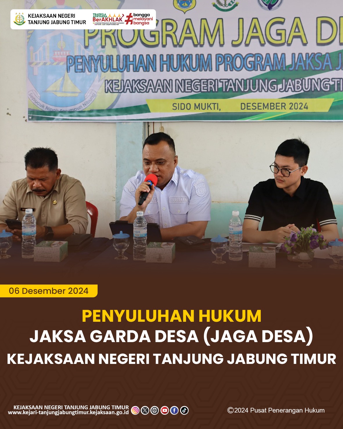 6 Desember 2024, pukul 10:00 WIB di Aula Kantor Desa Sido Mukti, Kepala Kejaksaan Negeri Tanjung Jabung Timur diwakili Seksi Intelijen (Rahmad