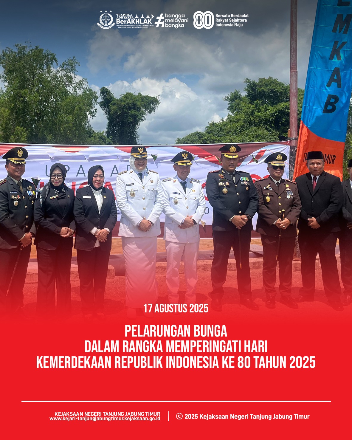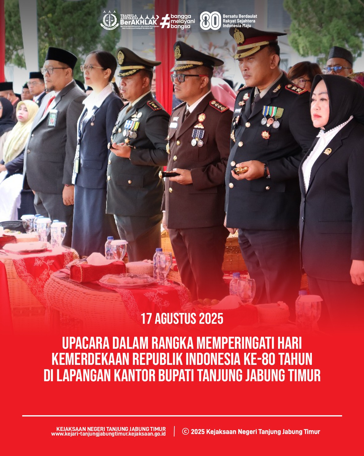 TANJUNG JABUNG TIMUR — Pemerintah Kabupaten Tanjung Jabung Timur menggelar upacara bendera untuk memperingati Hari Ulang Tahun (HUT) ke-80 Kemerdekaan Republik Indonesia.