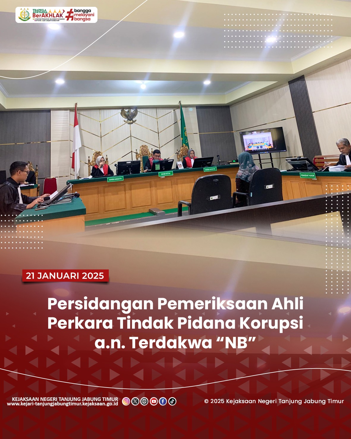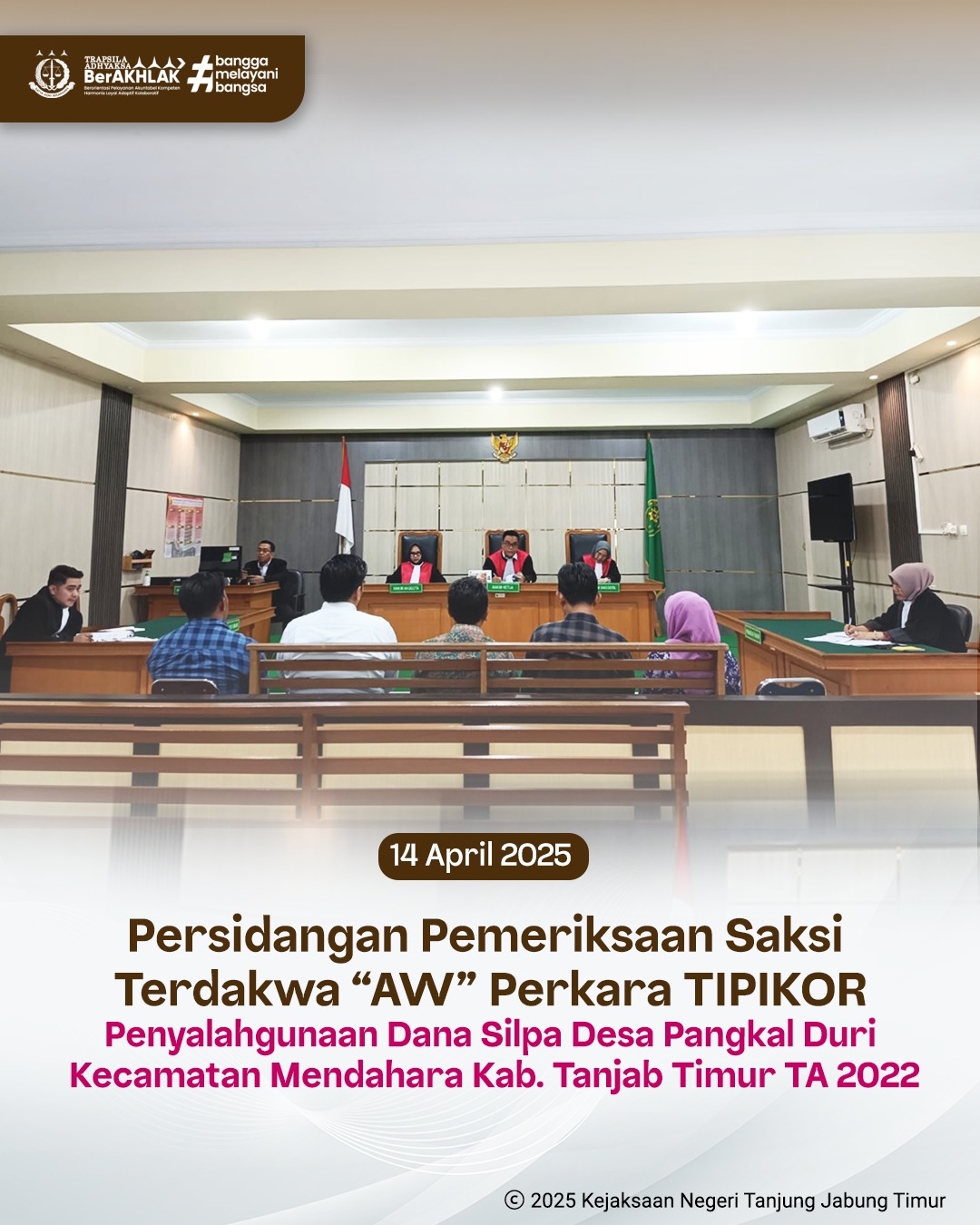 Pada hari Senin, 14 April 2025 pukul 13.00 WIB bertempat di Pengadilan Tipikor pada Pengadilan Negeri Jambi. Penuntut Umum Kejari Tanjung Jabung
