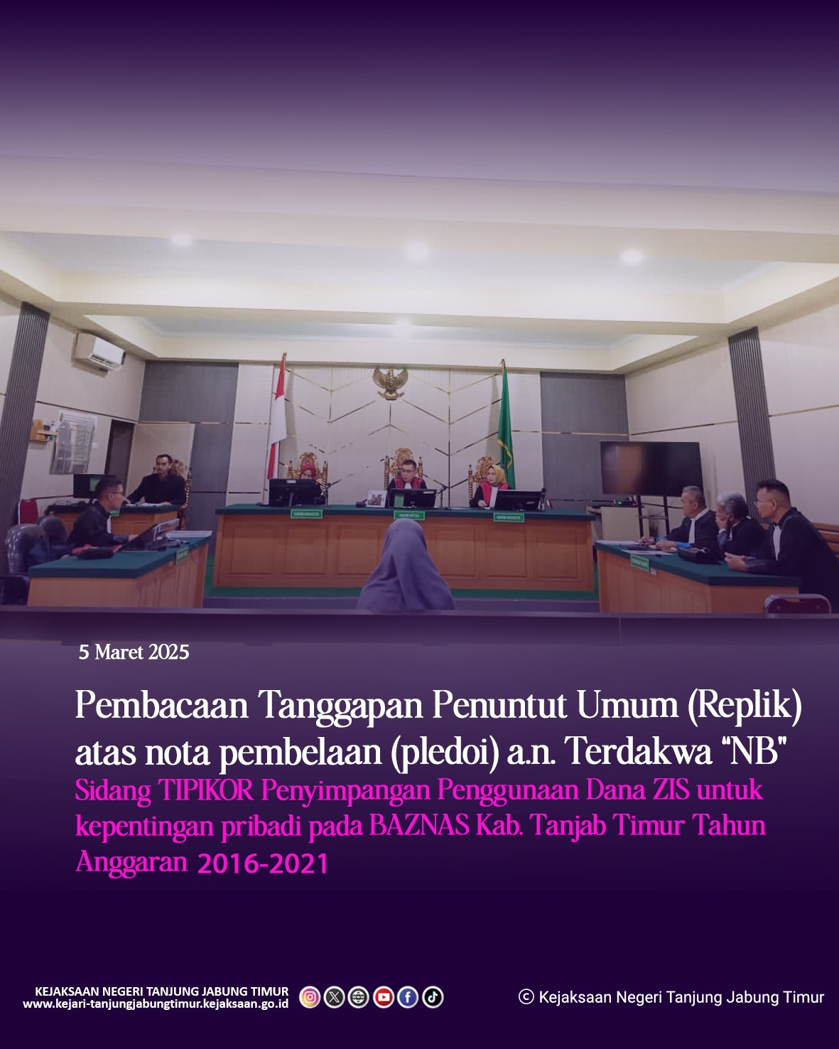 Persidangan Pembacaan Tanggapan Penuntut Umum (Replik) atas nota pembelaan (pledoi) a.n. Terdakwa “NB” perkara tindak pidana korupsi Penyimpangan Penggunaan Dana ZIS untuk kepentingan pribadi pada BAZNAS Kab. Tanjab Timur TA 2016-2021