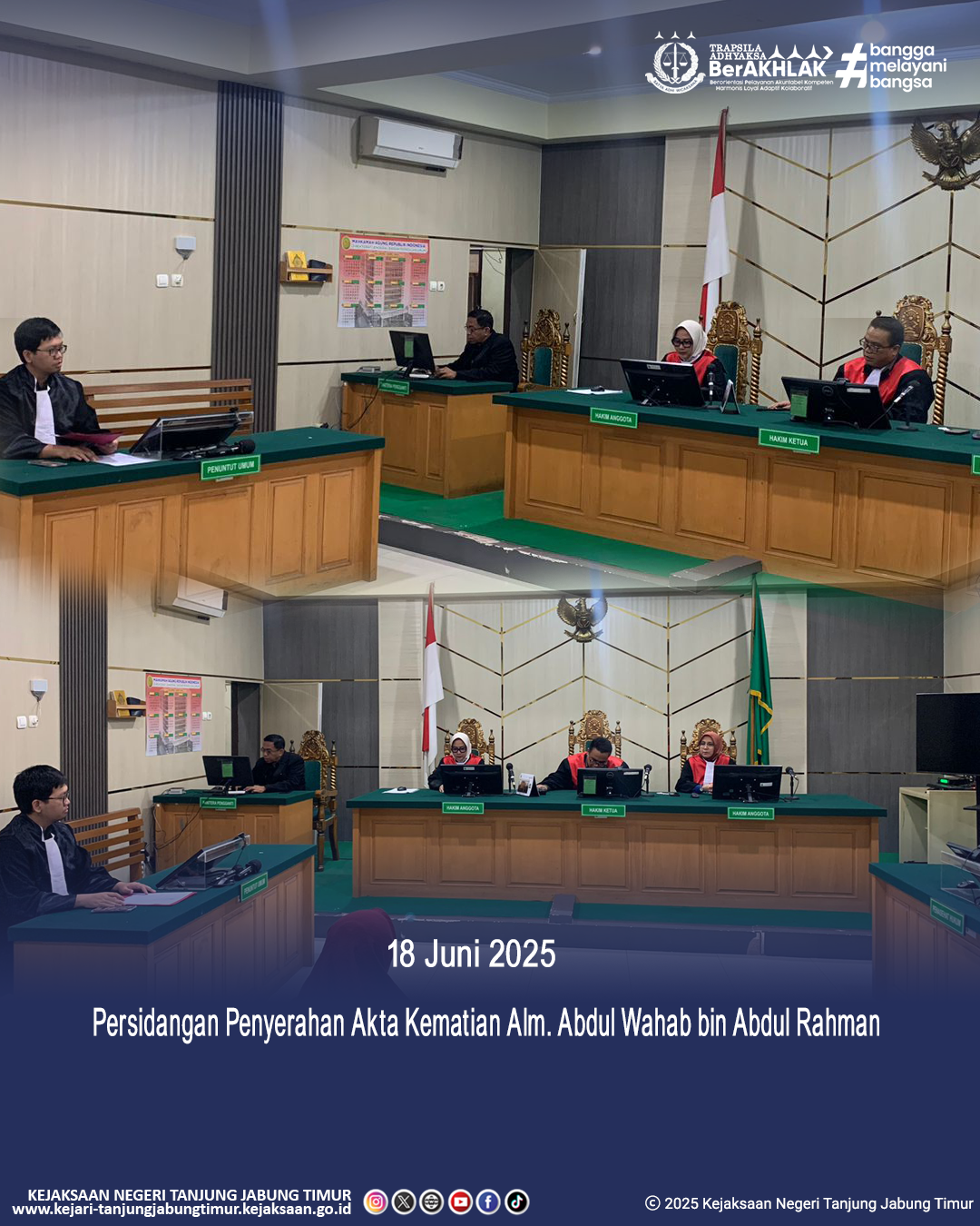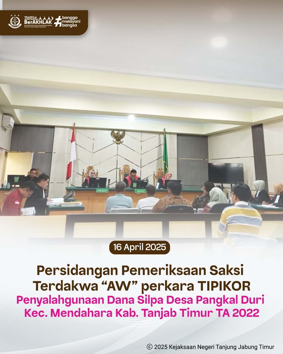 Pada hari Rabu, 16 April 2025 pukul 15.00 WIB bertempat di Pengadilan Tipikor pada Pengadilan Negeri Jambi. Penuntut Umum Kejari Tanjung Jabung