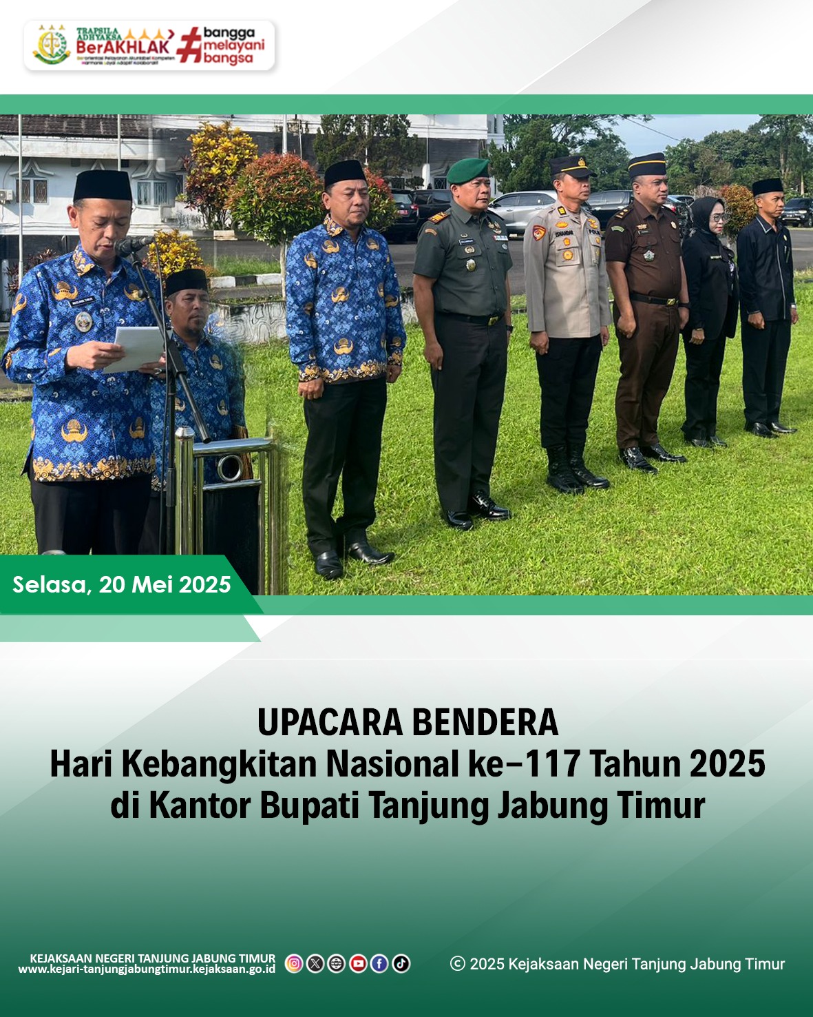 Pada hari Selasa, 20 April 2025 pukul 08:30 WIB, bertempat di Kantor Bupati Tanjung Jabung Timur. Kepala Kejaksaan Negeri Tanjung Jabung Timur diwakili Kepala Seksi Intelijen (Rahmad Abdul,S.H) telah menghadiri Upacara Bendera Dalam Rangka Hari Kebangkitan Nasional ke 117