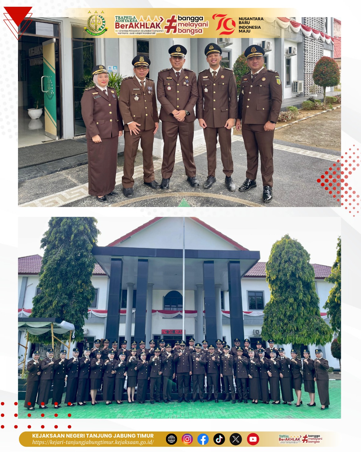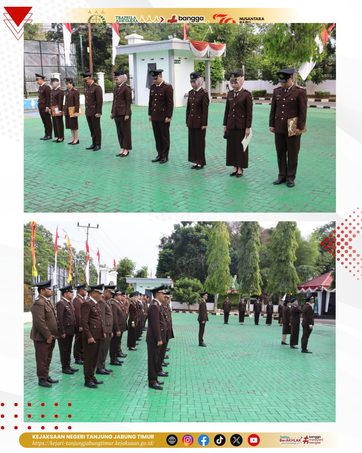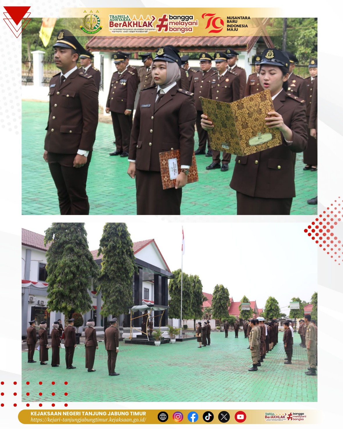 Pada hari Sabtu 17 Agustus 2024, pukul 07.30 wib s.d selesai bertempat di Lapangan Kantor Kejaksaan Negeri Tanjung Jabung Timur, Kejaksaan Negeri Tanjung Jabung Timur melaksanakan kegiatan Upacara Gabungan bersama Cabang Kejaksaan Negeri Tanjung Jabung Timur di Nipah Panjang untuk memperingati Hari Ulang Tahun Kemerdekaan Republik Indonesia ke-79 Tahun 2024 dengan tema “Nusantara Baru Indonesia Maju”. Inspektur Upacara dipimpin langsung oleh Kacabjari Tanjung Jabung Timur di Nipah Panjang (Bapak Yoyok Satrio, S.H., M.H.).