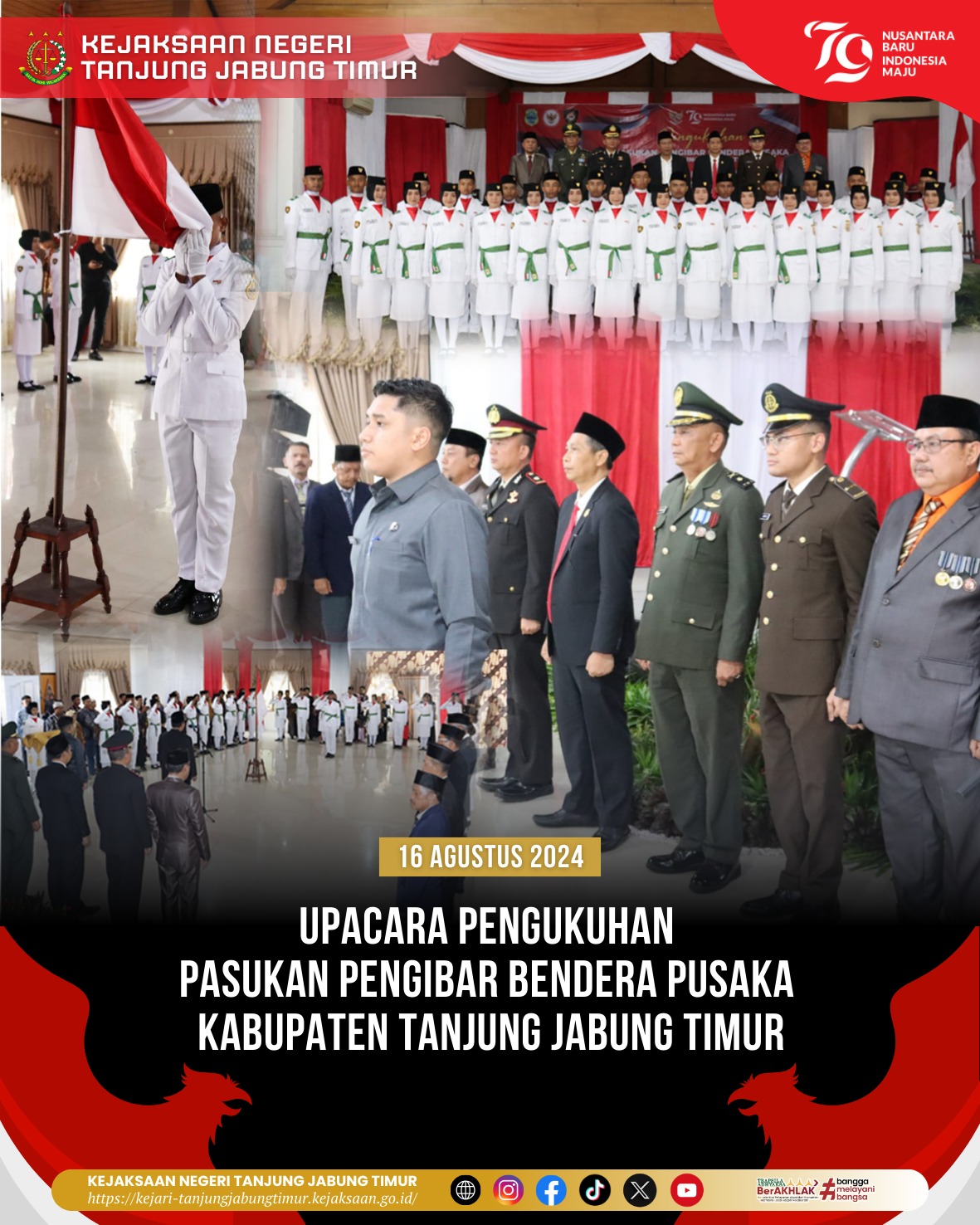 Pada hari Jum’at tanggal 16 Agustus 2024 jam 15.30 WIB bertempat di Aula Rumah Dinas Bupati Tanjung Jabung Timur. Kajari Tanung Jabung Timur diwakili Staf Pidsus (Gerry Gerry Enrico Robert Mangontan, S.H.) menghadiri Upacara Pengukuhan Pasukan Pengibar Bendera Pusaka Kab. Tanjung Jabung Timur.